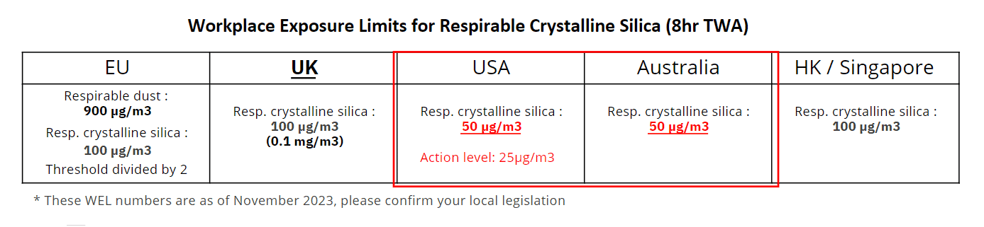 Many countries are passing stricter laws and regulations to limit employee exposure to respirable dust and in particular respirable crystalline silica. In Australia, these include higher fines and a recommendation to prohibit all engineered stone, while in the US there is currently a consultation process around new Mine Safety and Health Administration (MSHA) rules for RCS.
